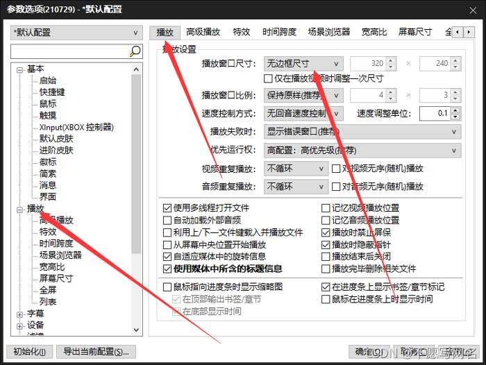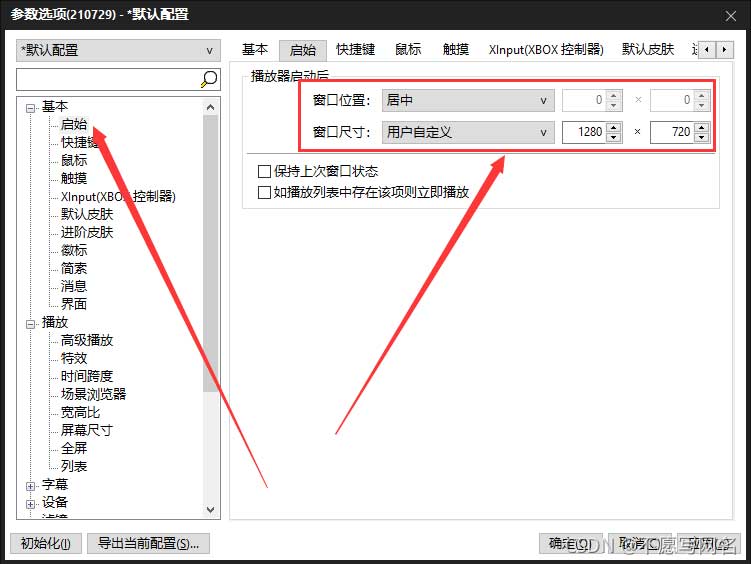 1.打开播放器按“F5”或右键PotPlayer播放界面点击选项进入设置界面,点开“基本”然后把启始项把窗口位置改成居中,把默认的320乘以240的窗口尺寸,建议1280乘以720,当然你也可以改成自己喜欢的尺寸