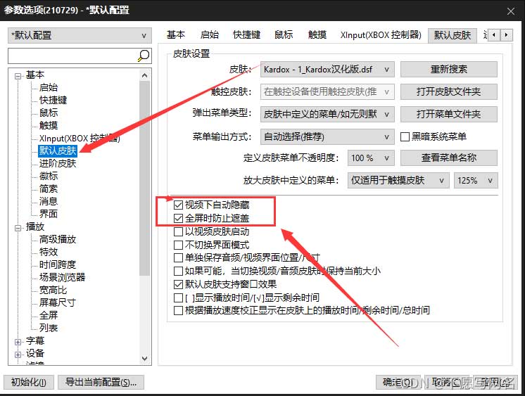 2.然后把默认皮肤下的视频下自动隐藏和全屏时防止遮盖进行勾选
