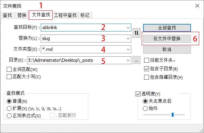 Notepad++批量修改文件内容所需软件: Notepad++步骤:将所需替换文件放到同一个文件夹里。用Notepad++打开其中的一个文件,执行搜索—查找—文件查找填好查找目标、替换为、文件类型(如:*.md)、目录,最后点击在文件中替换。参考:windows批量查找替换多个文本文件中的内容